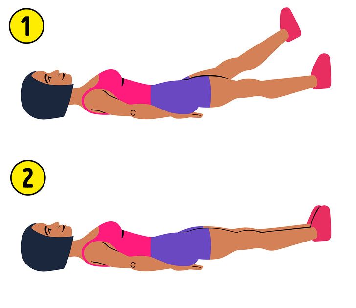 ✓ Từ từ hạ hai chân về vị trí ban đầu, lưu ý ép sát lưng xuống mặt sàn.